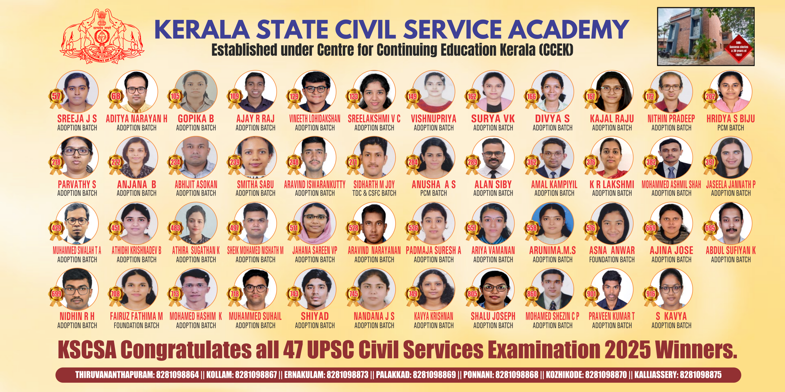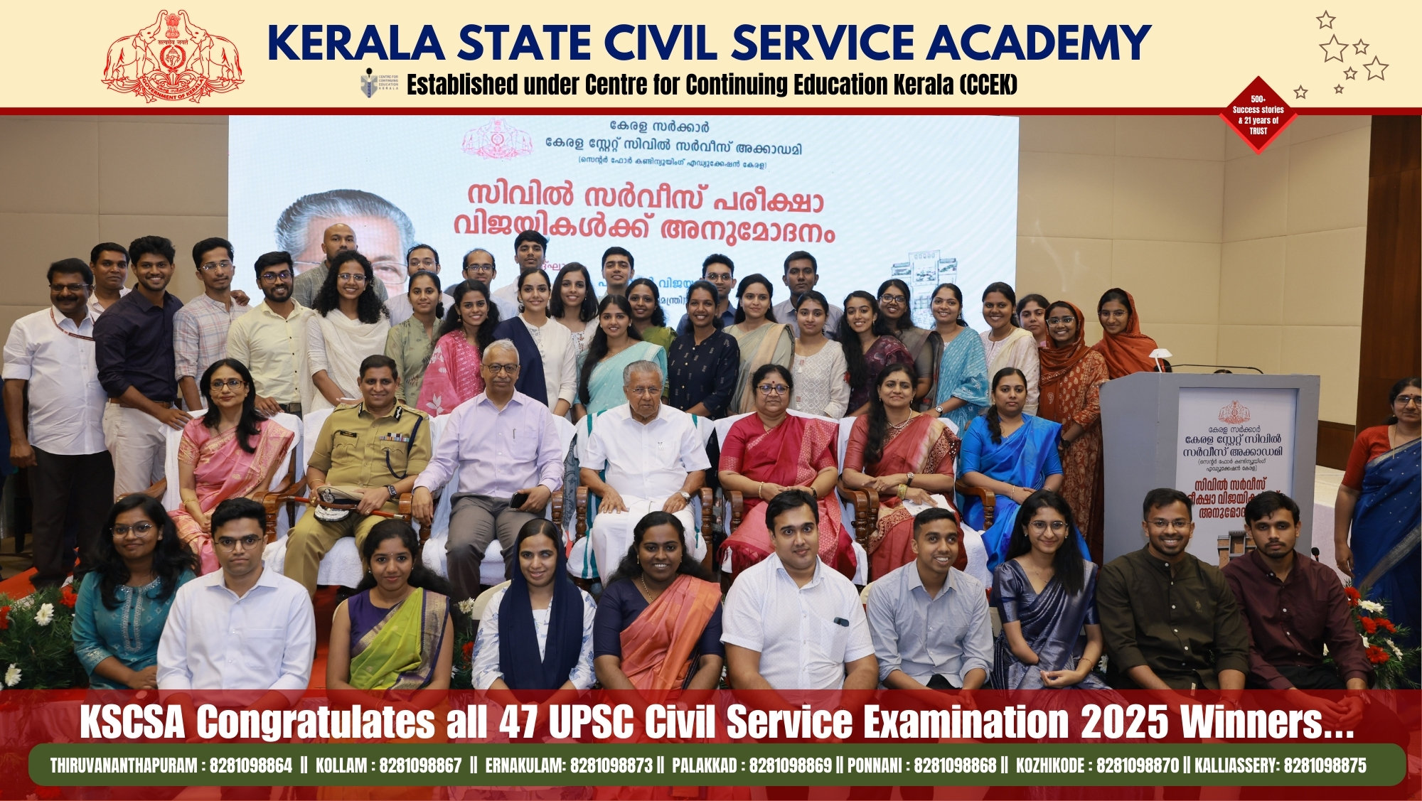 Kerala State Civil Service Academy was established in February 2005 by the Government of Kerala under Centre for Continuing Education Kerala (CCEK), an autonomous body under the administrative control of the Higher Education Department of the State Government. The Academy has been set up with the specific objective of giving intensive coaching to the young men and women of our State who aspire for top posts in the country’s civil services. Kerala State Civil Service Academy is situated at a highly convenient spot in the capital city: at Charachira, Kowdiar, Thiruvananthapuram. The Academy and its library are fully air-conditioned with Wi-Fi internet connectivity round the clock. The Academy’s library has hundreds of books and journals making it one of the best of its kind in India.